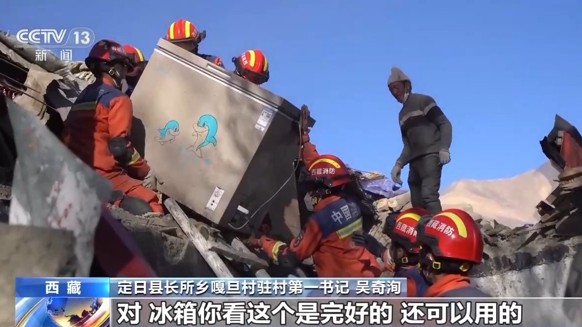 *定日縣長所鄉嘎旦村駐村第一書記 吳奇**洵:*今天開始的,確定好了哪些户的具體位置,就開始幹了。冰箱是完好的,還可以用的,所以他們把能救出來的都救出來。
