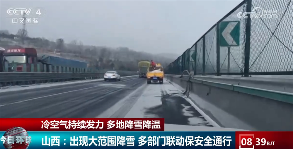 受冷空氣影響,山西也出現大範圍降雪天氣,部分高速公路出現積雪結冰現象,為保障通行安全,當地交管部門聯合路政養護部門掃雪除冰。在青銀高速山西吳城段,民警加強巡邏次數,並通過警報喊話的方式提醒過往司機減速慢行。