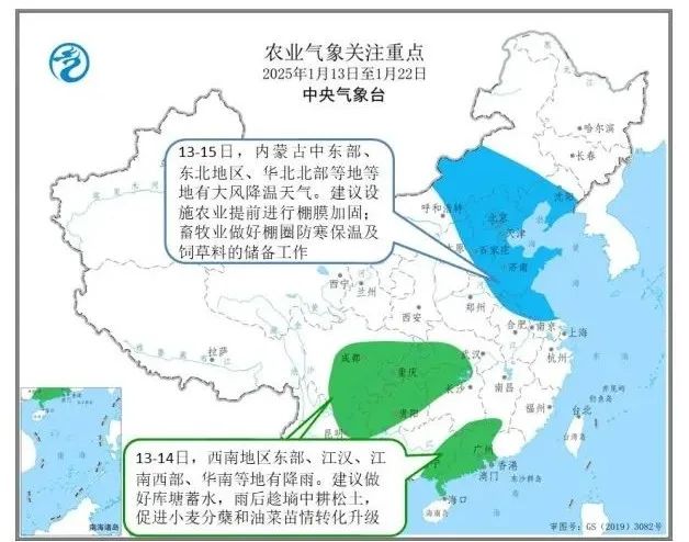 13日至15日,受較強冷空氣影響,中東部大部氣温下降4℃至6℃,東北地區、西北地區東部、內蒙古中西部、江漢、江淮、江南東部等部分地區降温8℃以上,且內蒙古中東部、東北地區、華北北部等地有4至6級風,大風降温天氣導致設施温棚和畜禽圈舍取暖成本增加,長勢偏弱的油菜、露地蔬菜等有受凍風險。