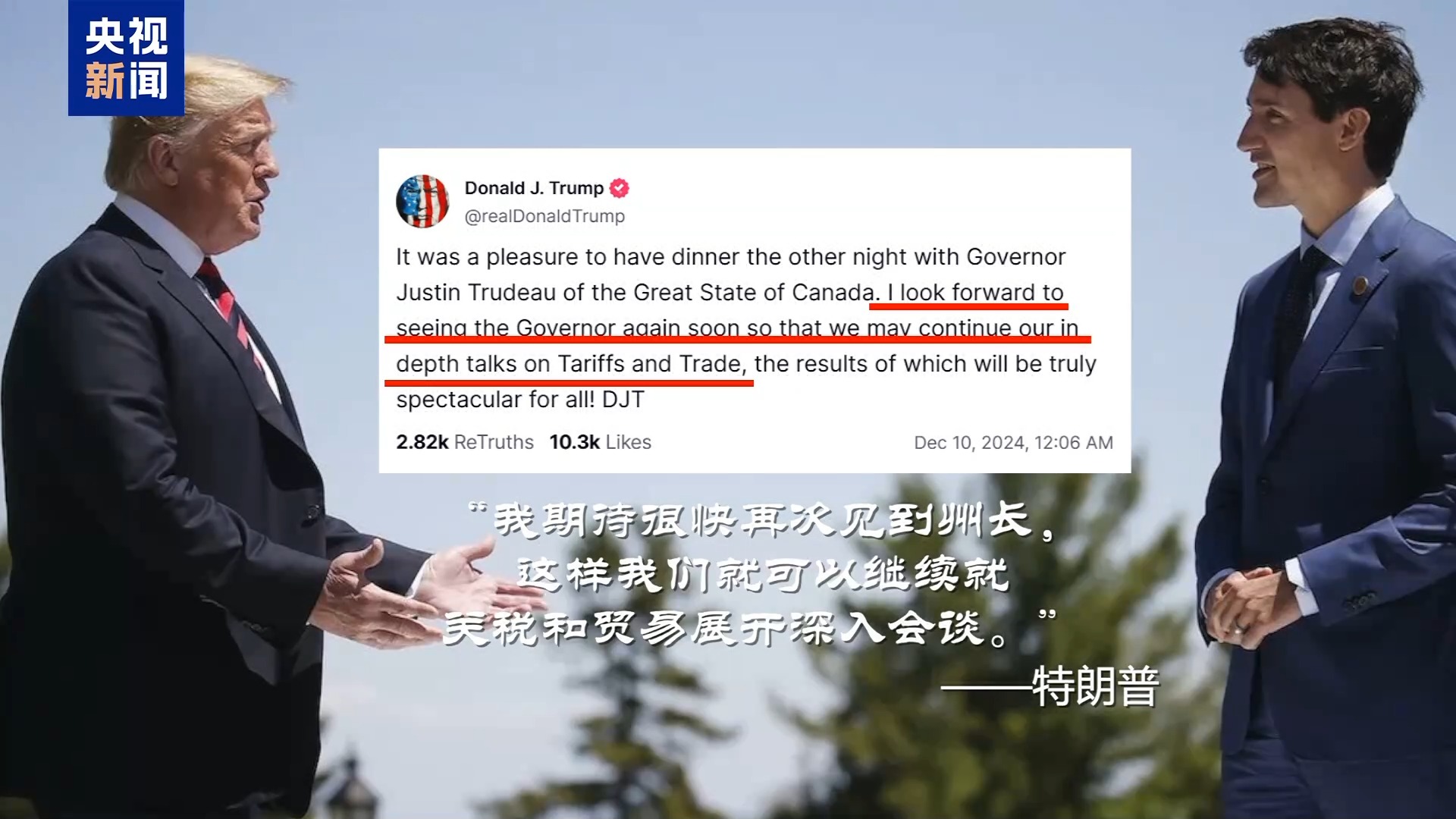 在特朗普發出關税威脅4天后,2024年11月29日晚,特魯多親赴美國佛羅里達州的海湖莊園,與特朗普共進晚餐。在席間,特朗普表示,也許加拿大應該成為美國的第51個州,特魯多可以當“州長”。