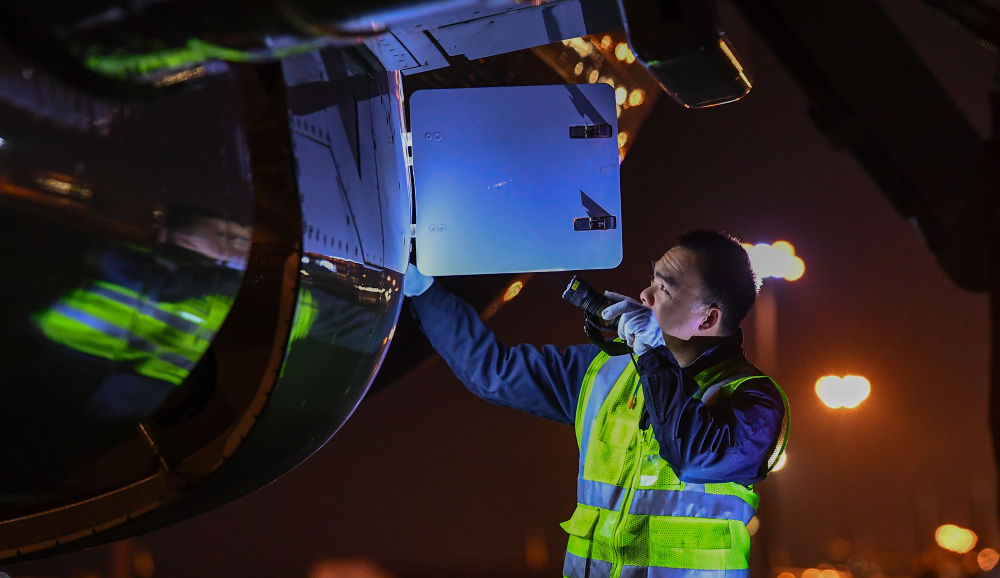 1月11日,在海口美蘭國際機場停機坪上,南航工程技術分公司機務工程師對飛機進行深度檢查。新華社記者 楊冠宇 攝