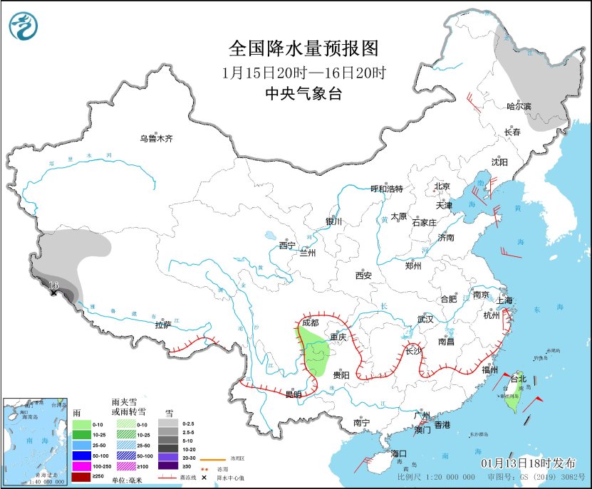 *1月13日20時至14日20時,*內蒙古中東部、黑龍江中東部、吉林東部、西藏東部、甘肅河西、川西高原北部等地部分地區有小雪或雨夾雪,其中,西藏東北部、川西高原北部等地部分地區有中到大雪(5~9毫米)。西藏東南部、江淮西部、江漢東部、湖南北部、四川盆地、重慶、廣西東南部、廣東西南部、海南島中東部等地部分地區有小雨,其中,海南島東部局部地區有中雨。內蒙古、東北地區南部、華北、黃淮、西藏大部等地部分地區有4~6級風;渤海、黃海中北部海域、台灣海峽、南海中南部海域、北部灣將有5~6級、陣風7級的大風(見圖1)。