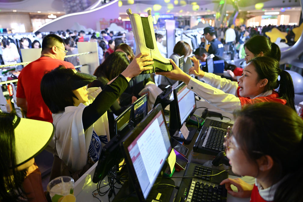 2024年9月28日,觀眾在中國—東盟博覽會上挑選秘魯羊駝毛公仔。(新華社記者 周華 攝)