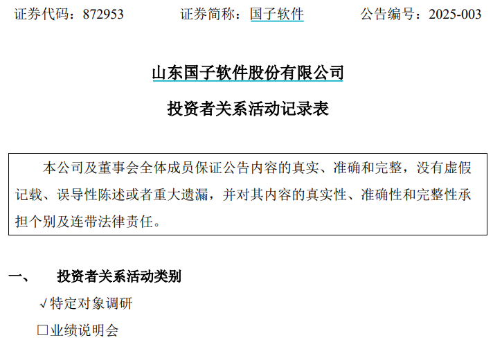 【環球網財經記者 田剛】2025年1月13日,北交所上市公司國子軟件(872953.BJ)發佈了《投資者關係活動記錄表》,披露公司接待了中郵證券的現場調研,公司總經理韓承志、董事會秘書王蕾兵等管理層人士參與,並解答投資機構代表提問。
