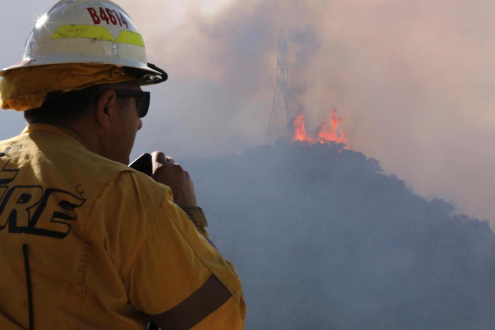 1月11日,消防員在美國加利福尼亞州洛杉磯曼德維爾峽谷的一座山丘頂部觀望野火火勢。新華社發(邱晨攝)
