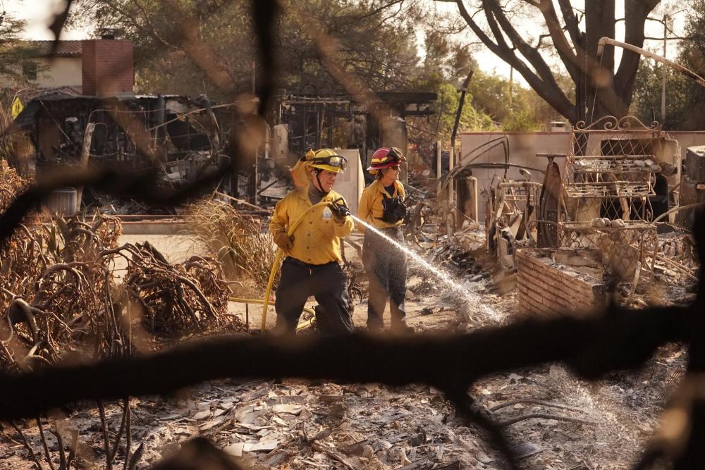 1月10日,在美國加利福尼亞州洛杉磯縣阿爾塔迪納地區,消防員正在努力撲滅山火過後建築周圍的熱點區域。新華社發(曾慧攝)
