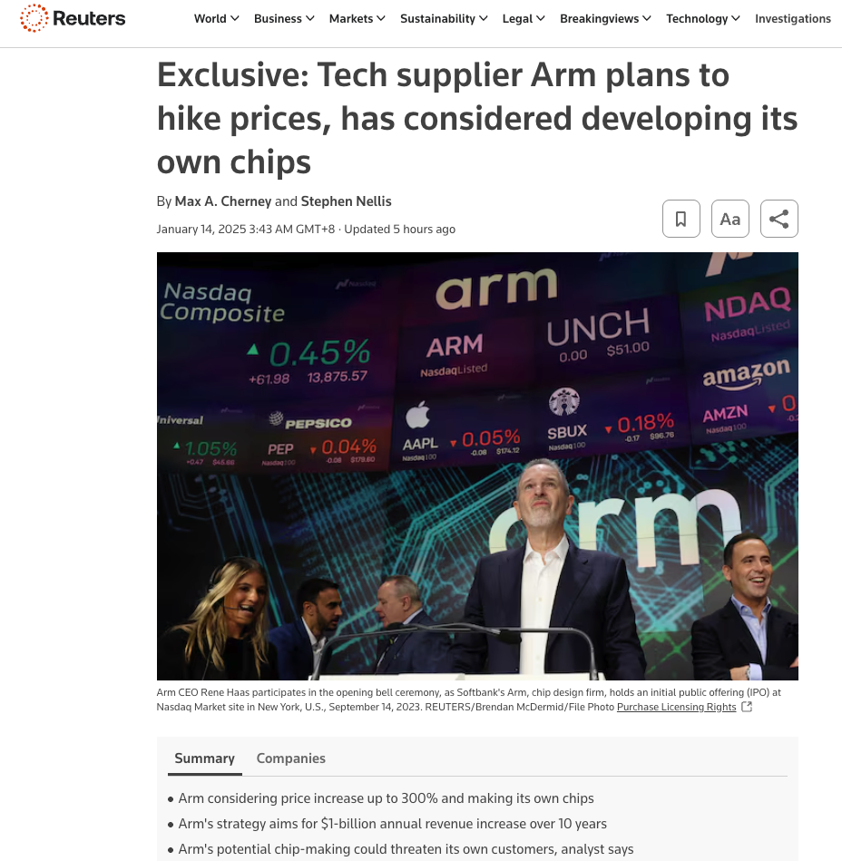 【環球網科技綜合報道】1月14日消息,據路透社報道,芯片技術供應商Arm Holdings(ARM)正在醖釀一項重大長期戰略調整,計劃將其芯片設計授權費用提高高達300%,並考慮自主研發芯片,以直接與其最大的客户展開競爭。