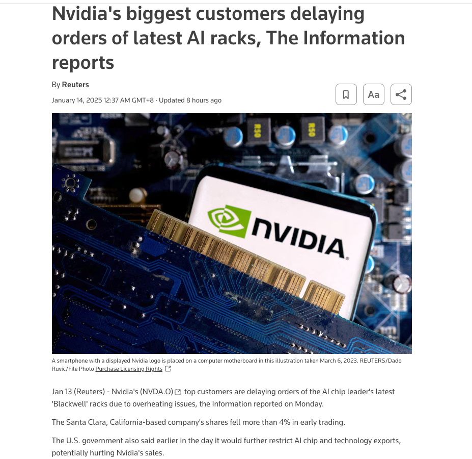 【環球網科技綜合報道】1月14日消息,據多家外媒報道,圖形處理器(GPU)製造商英偉達(NVIDIA)再次延遲了其數據中心AI芯片的交付時間。據報道,此次延遲的主要原因在於裝有最新Blackwell芯片的機架出現了過熱問題,並且芯片之間的互聯也存在故障。