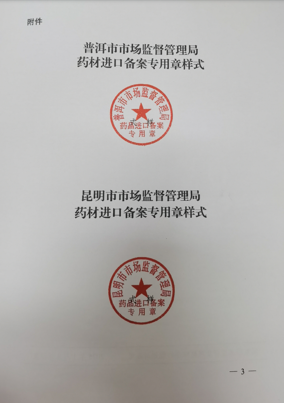 二、普洱市市場監督管理局和昆明市市場監督管理局分別承擔勐康口岸和磨憨口岸(含磨憨鐵路口岸)進口藥材備案工作,在辦理進口藥材備案時使用“藥品備案專用章”,印章式樣見附件。
