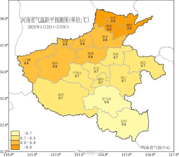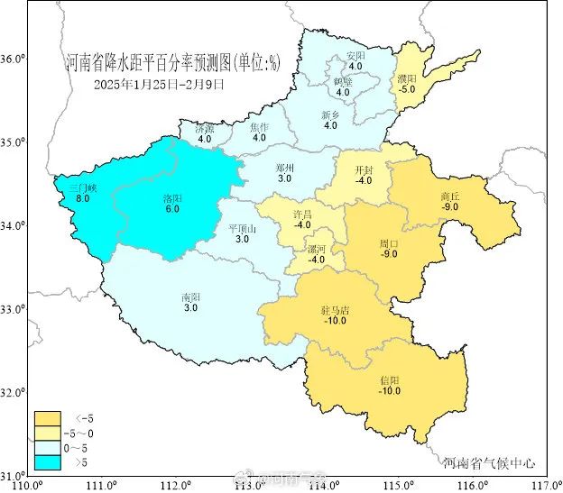 説明:本氣候預測產品是河南省氣候中心綜合多個數值-統計模式結果來預測未來一段時間內的天氣相對氣候平均態的偏離情況。由於預測時間較長,氣候預測產品具有一定的不確定性,公眾需客觀認識氣候預測的不確定性,同時關注預測產品的滾動更新,科學合理運用氣候趨勢預測結果。