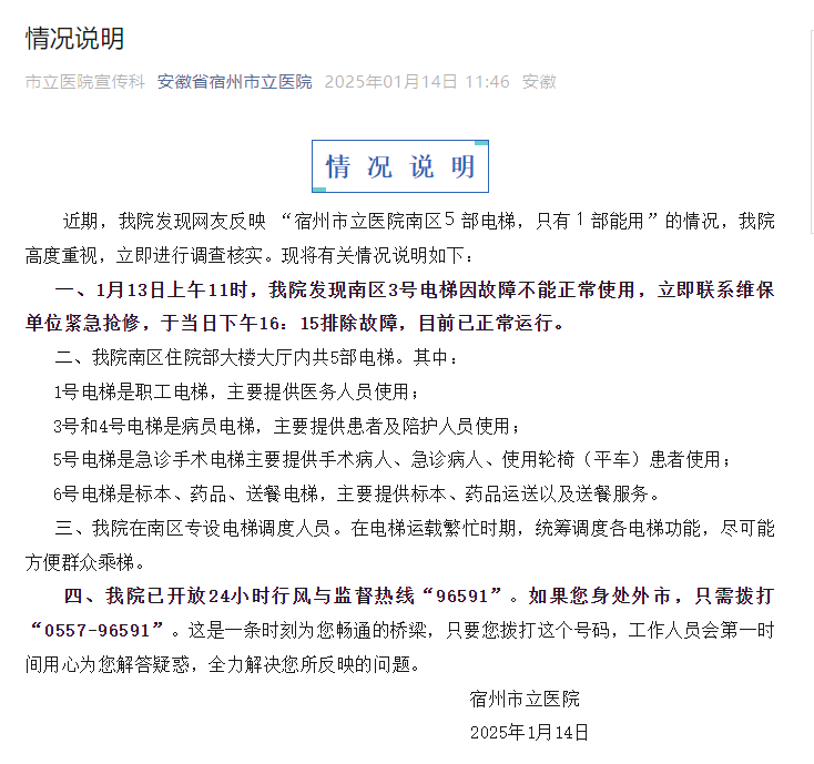 近期,我院發現網友反映 “宿州市立醫院南區5部電梯,只有1部能用”的情況,我院高度重視,立即進行調查核實。現將有關情況説明如下: