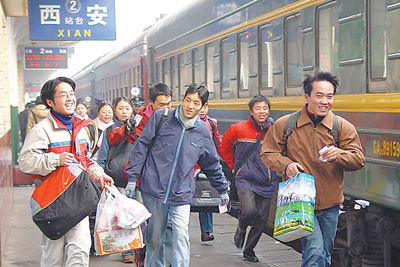 2004年,放假回家的大學生在西安火車站趕火車。