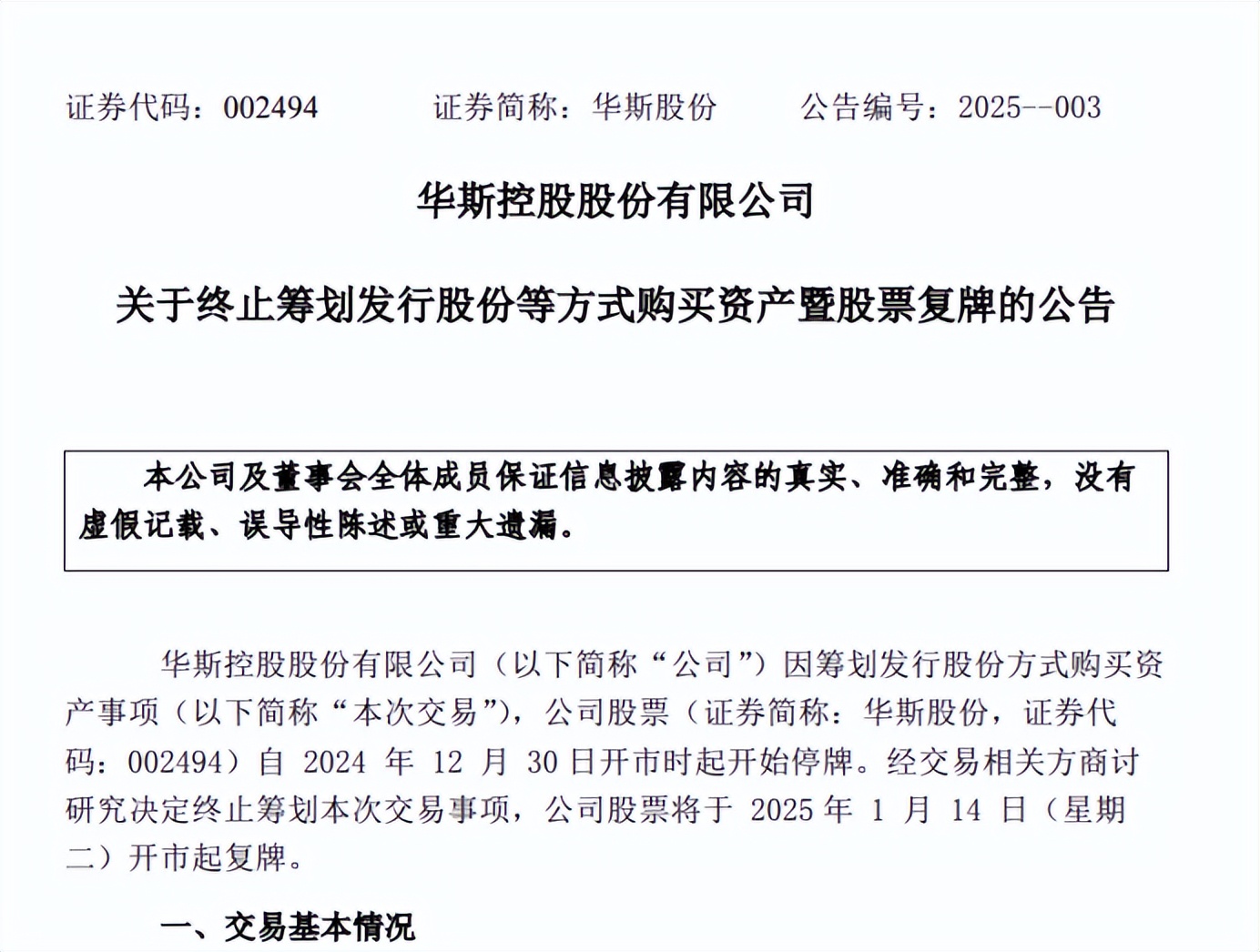【環球網財經綜合報道】1月13日晚間,華斯股份(股票代碼未提供)發佈公告稱,公司決定終止籌劃發行股份及支付現金購買京信科技控制權並募集配套資金的交易事項。公告指出,自交易啓動以來,儘管公司對標的方進行了盡職調查,但交易相關方未能就交易方案所涉事項最終達成共識,因此決定終止本次交易。同時,華斯股份股票將於2025年1月14日開市起復牌。