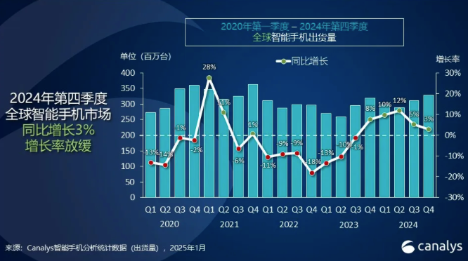 【環球網科技綜合報道】1月14日消息,據市場分析機構Canalys最新報告,2024年第四季度,全球智能手機市場增長3%,達到3.3億台。市場實現了連續五個季度的正增長,但增長率正明顯放緩。