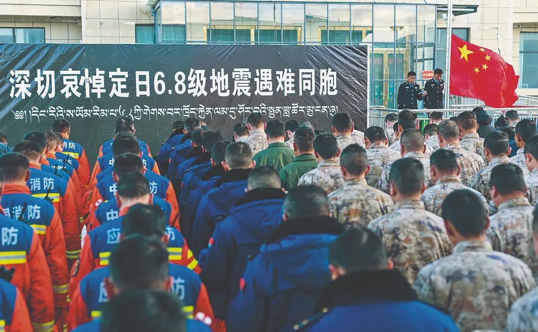 13日9時30分,西藏定日6.8級地震遇難同胞悼念儀式在受災最嚴重的定日縣長所鄉舉行。參與救援的解放軍和武警部隊官兵、民兵、消防救援人員、公安民警、醫護人員、青年志願者及有關企業員工、幹部職工、震區羣眾代表數百人,神情凝重,默然肅立,向遇難同胞靜靜默哀。