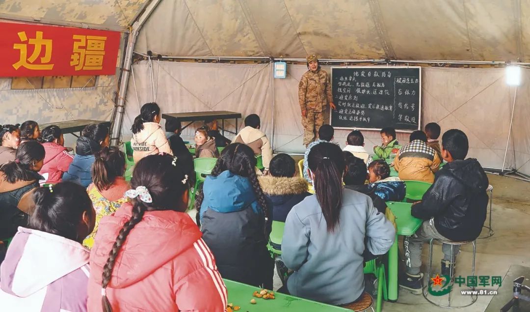 1月13日,西藏軍區青藏兵站部某部官兵在措果鄉吉翁村開設“帳篷學校”,為災區兒童開展自救、衞生、心理教育。路前進 攝