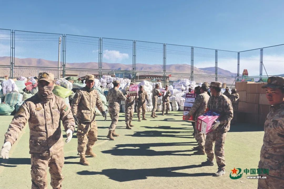 在各安置點,任務部隊官兵和民兵全力保障受災羣眾生活。西藏軍區青藏兵站部、武警西藏總隊出動官兵在受災鄉鎮清理廢墟、轉運物資。在長所鄉森嘎村安置點,武警西藏總隊派出炊事員為受災羣眾供應熱食。