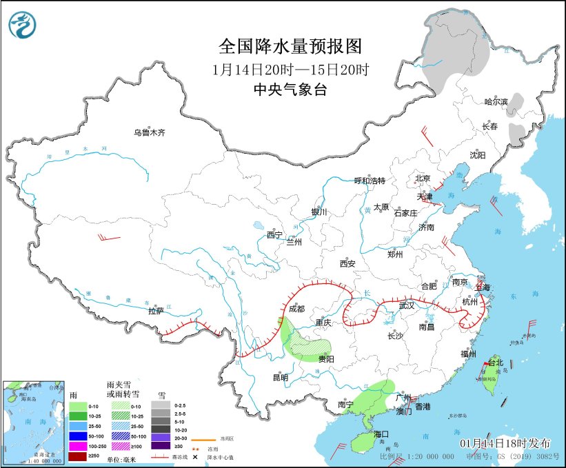 *1月14日20時至15日20時,*內蒙古東北部、黑龍江西北部、吉林東部、貴州西北部等地部分地區有小雪或雨夾雪。四川盆地南部、貴州西部、雲南東北部、廣西東南部、廣東西南部、海南島、台灣島等地部分地區有小雨。內蒙古東南部、華北大部、黃淮東部、江淮東部以及西藏中北部等地部分地區有4~6級風,渤海、渤海海峽、黃海大部海域、東海大部海域、台灣海峽、台灣以東洋麪、巴士海峽、南海北部和中部海域、北部灣將有7~8級、陣風9級的大風,其中台灣海峽部分海域風力可達9級、陣風10級(見圖2)。