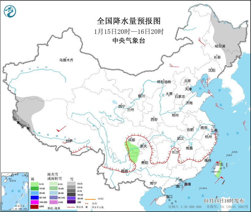 圖2 全國降水量預報圖(1月14日20時-15日20時)