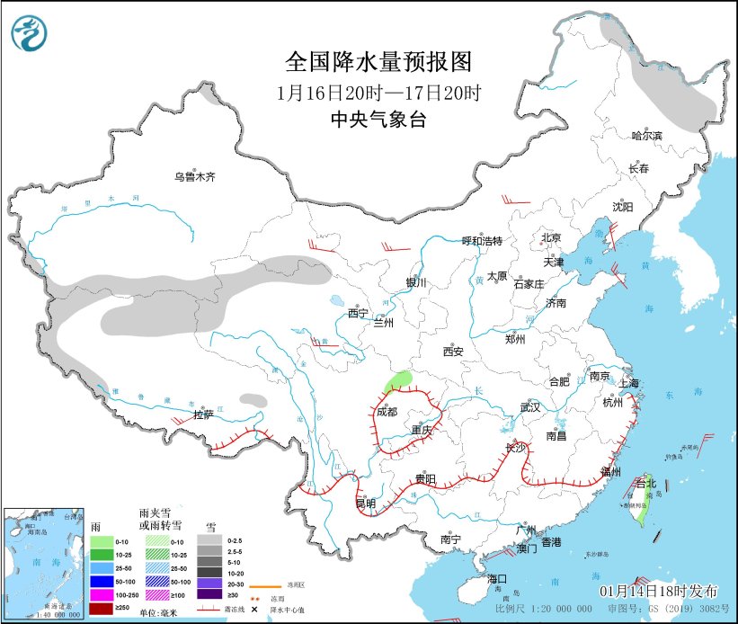 圖4 全國降水量預報圖(1月16日20時-17日20時)