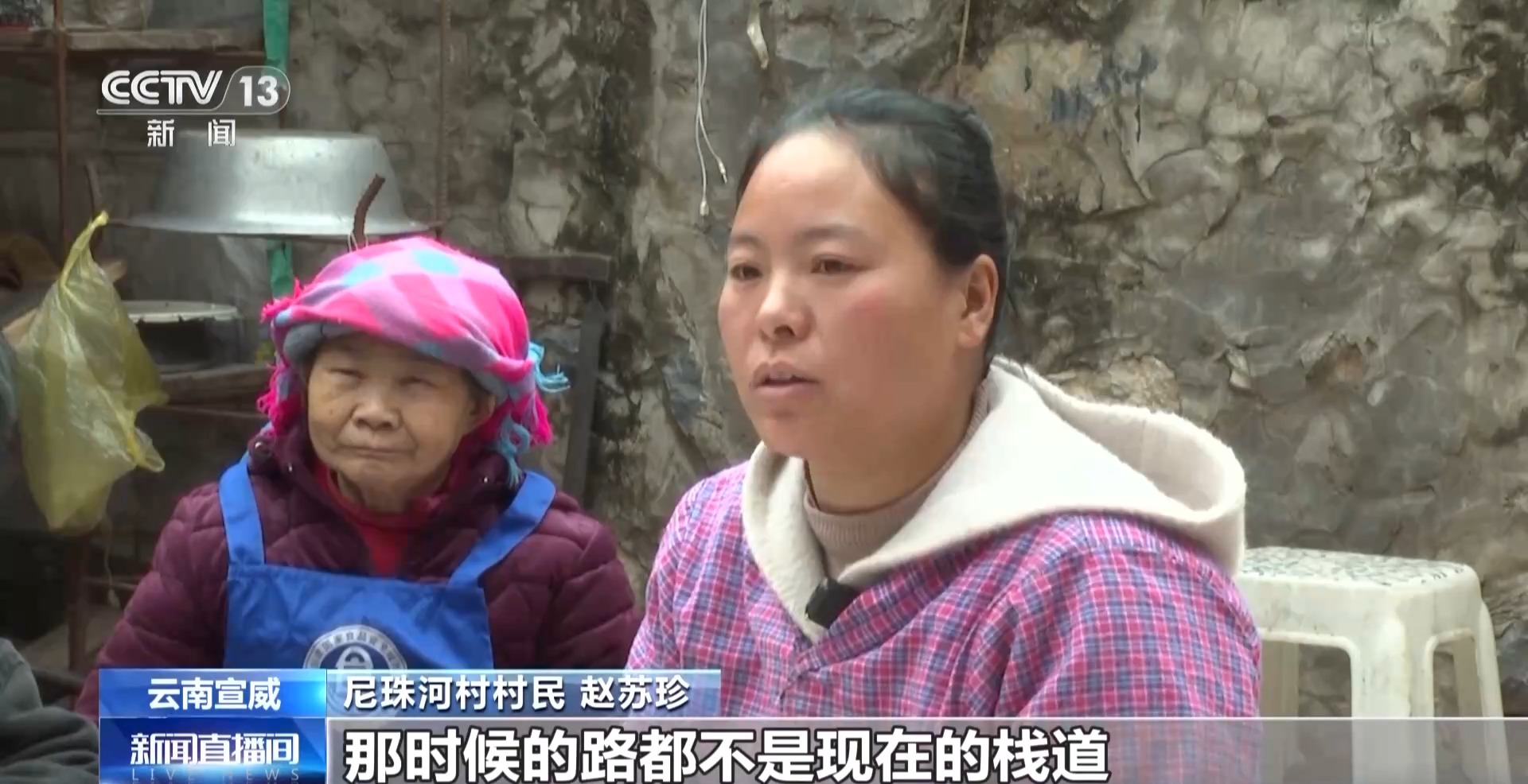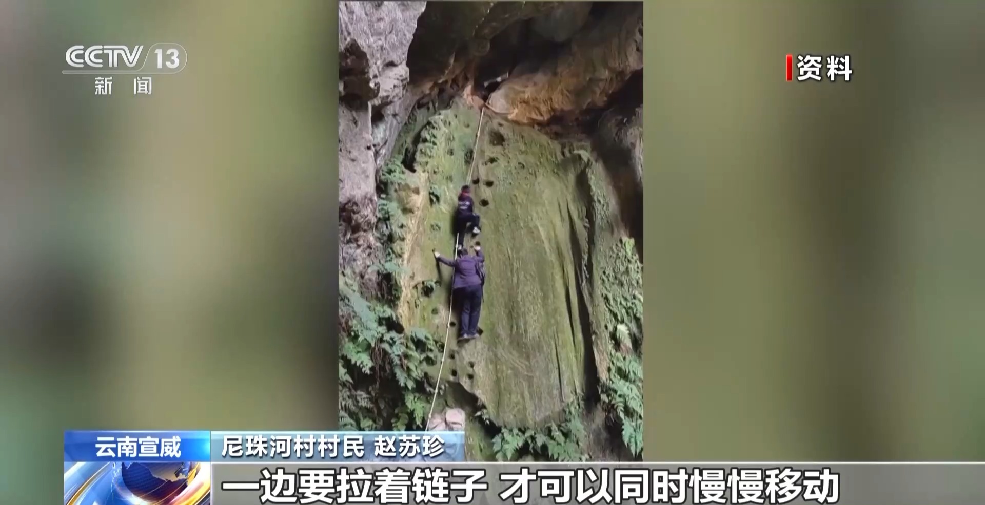 *尼珠河村村民 趙蘇珍:*那時候的路都不是現在的棧道,那個路都是他們爺爺那時候拿鏨子和錘,打了一些石頭坎坎,才可以慢慢爬上去。兩隻腳要搭配踩坎坎,一邊要拉着鏈子,才可以同時慢慢移動,才可以上去。最難走的就是用一個繩子吊着的,自己還要掌握好了才能爬上去。