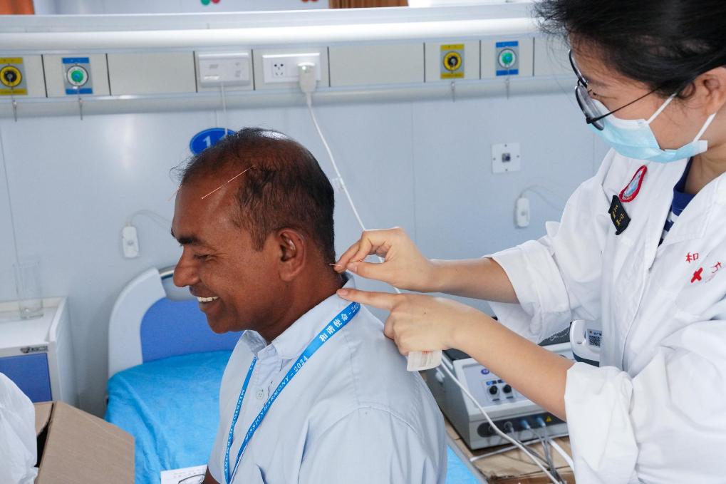 2024年12月24日,在斯里蘭卡科倫坡港,中國海軍“和平方舟”號醫院船上的醫生為當地居民做針灸。新華社記者伍嶽攝