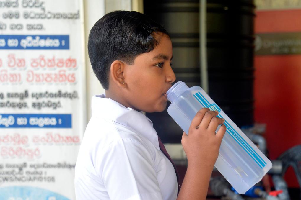 2024年10月2日,在斯里蘭卡中北部地區尼迪亞村,學生正在中國援建的飲用水裝置旁飲水。新華社發(加揚·薩米拉攝)