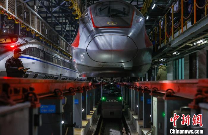 春運即將啓幕,1月13日晚11時許,走進華中最大動車檢修基地——武漢動車段,武漢動車運用車間裏燈火通明,伴隨鳴笛聲和通風機轟隆隆的聲音,一列列動車或緩緩駛入檢修庫,或停留在軌道進行檢修。