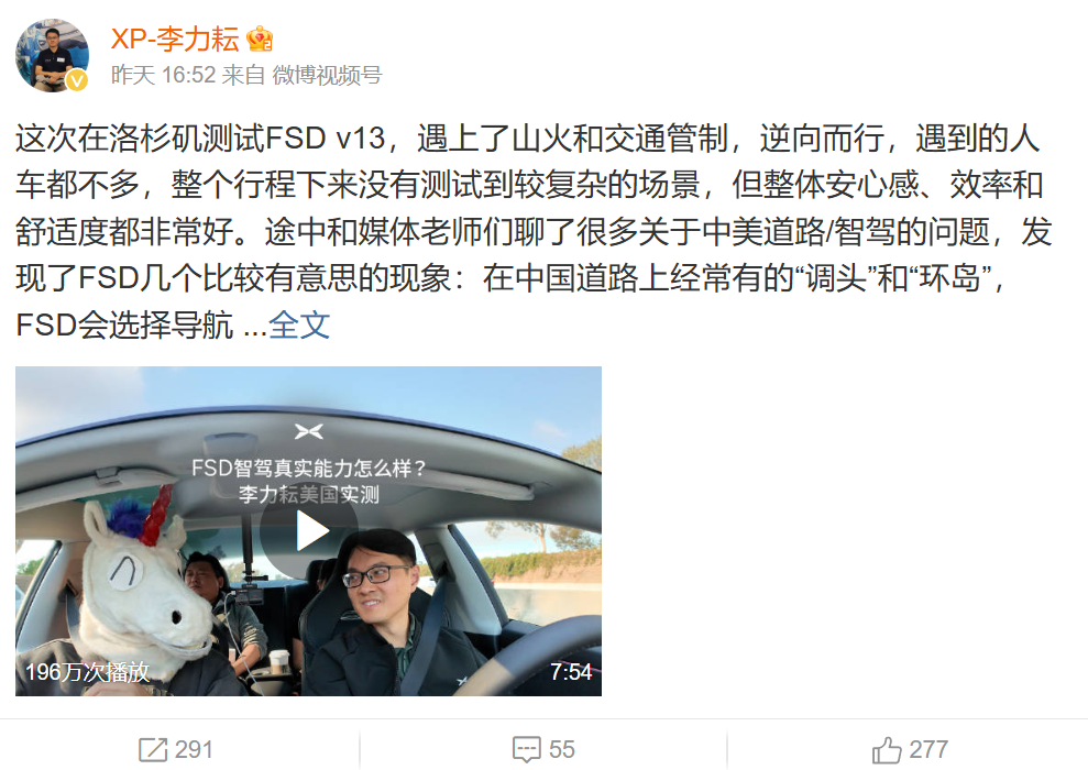 【環球網智駕綜合報道】1月15日消息,小鵬汽車自動駕駛負責人李力耘在美國洛杉磯對特斯拉 FSD V13.2 版本進行了深度體驗,並分享了其使用感受。