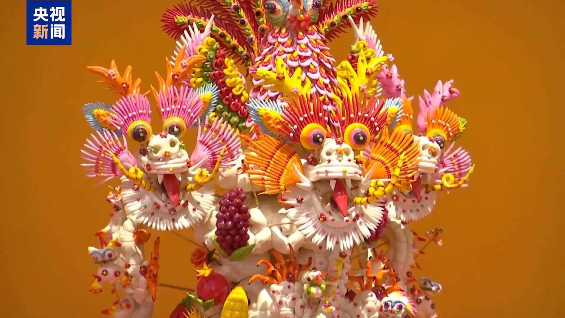 由地方非遺傳承人制作,傳統與創新兼具的面花作品《龍鳳棗山》,用搓、揉、編等10多道工序結合製作而成,吸引了不少觀眾駐足觀看。