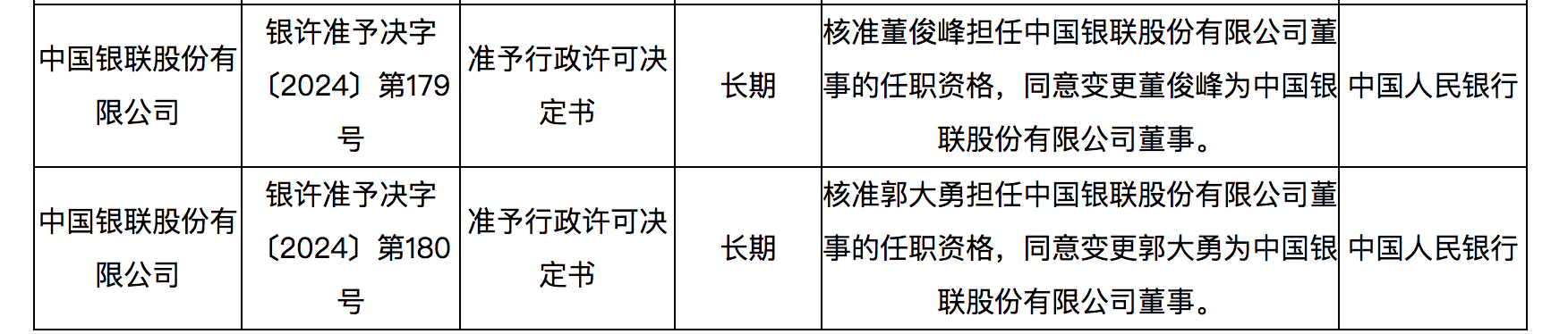中國人民銀行於2024年12月31日公示的任職資格核准信息顯示,董俊峯和郭大勇已獲核准擔任中國銀聯董事。此前,董俊峯擔任中國銀聯黨委書記,而郭大勇則擔任中國銀聯的黨委副書記。