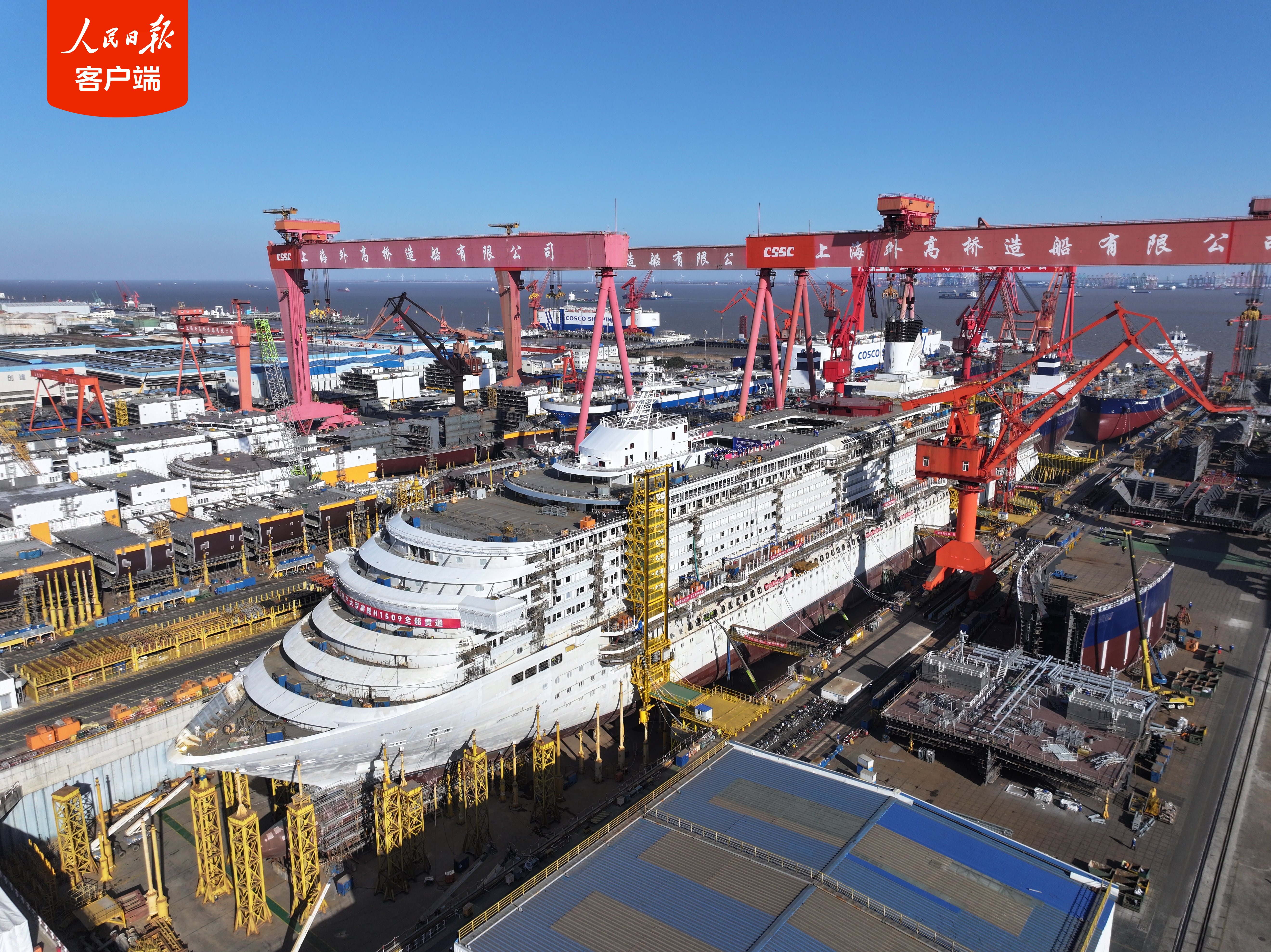 1月15月上午,隨着郵輪大煙囱的吊裝到位,備受關注的第二艘國產大型郵輪H1509船(“愛達·花城號”)在中國船舶集團有限公司旗下上海外高橋造船有限公司2號船塢內實現了全船貫通的里程碑節點,全面轉入全船內裝工程、設備、系統調試下半場。特別值得一提的是,從入塢總裝搭載到全船貫通,僅用時不到9個月,較首制船縮短了2個多月,建造速度比肩歐洲頂尖大型郵輪建造企業,標誌着中國船舶工業在初步掌握設計建造關鍵核心技術的同時,向着系列化、精益化和高效化建造的大型郵輪2.0目標又邁出了堅實的一步。