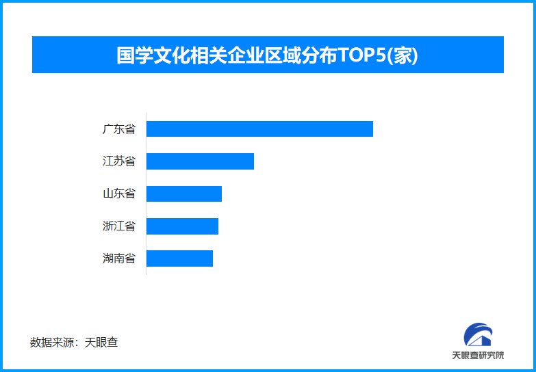天眼查專業版數據顯示,截至目前我國現存在業、存續狀態的國學文化相關企業超9.7萬家。其中,2024年新增註冊相關企業超5700餘家。從區域分佈來看,廣東省以近2萬家國學藝術相關企業數量排在首位,佔全國企業總數的20.4%。排在其後的是江蘇省、山東省、浙江省與湖南省。