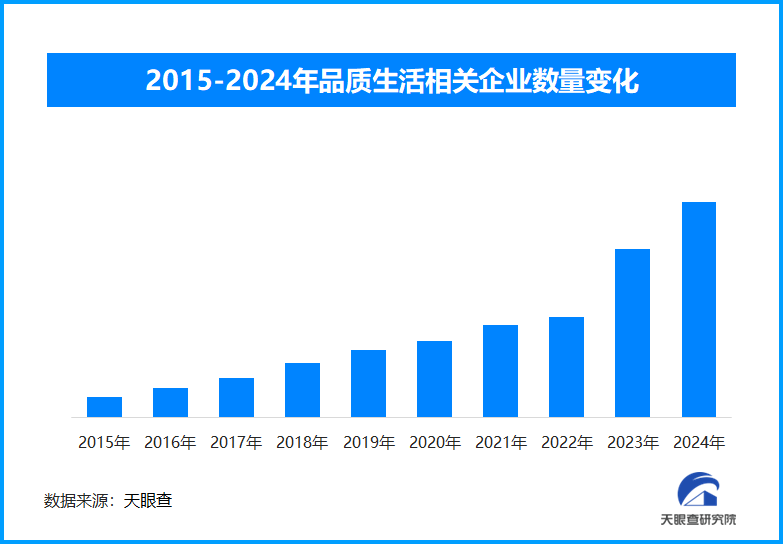 天眼查專業版數據顯示,截至目前我國現存在業、存續狀態的品質生活相關企業超108.6萬家。其中,2024年新增註冊相關企業超25.7萬餘家。從企業註冊數量趨勢來看,近十年間,品質生活相關企業的註冊數量呈現出逐年增長的態勢,特別在2023和2024兩年更是呈現出明顯漲勢,這反應了人們對品質生活的追求以及市場的自然反饋。