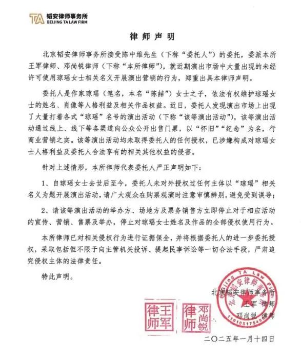 1月14日,著名作家瓊瑤兒子陳中維委託律師發佈聲明,針對近期演出市場中大量出現的未經許可使用瓊瑤相關名義開展的演出活動,明確表示這些活動均未獲得任何授權。