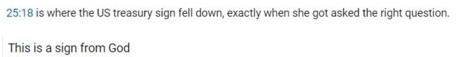 有網友在耶倫的這段視頻下跟帖暗示:美國財政部徽標剛好在耶倫被問到“正確”問題的時候掉落,(其中喻意不言自明)。