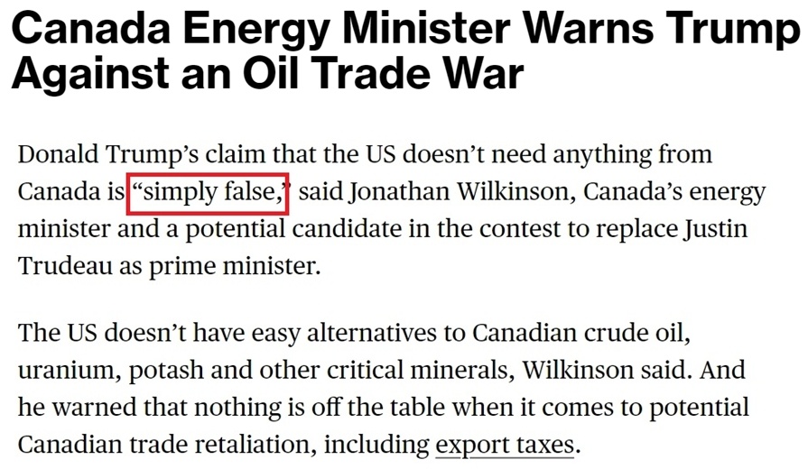 對此,加拿大自然資源部長威爾金森日前接受彭博社採訪時表示,這種説法“完全是錯誤的”。對於加拿大的原油、鈾、鉀鹽以及其他關鍵礦產,美國很難輕易找到替代品。