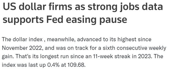 在上週最後一個交易日,美元指數漲至109.68點,達到2022年11月以來的最高水平。