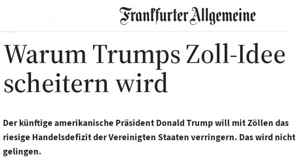 德國《法蘭克福匯報》日前發表題為《特朗普的關税想法為何會失敗》的文章指出,特朗普痴迷於加徵關税,是因為他錯誤地認為貿易逆差是洪水猛獸。但從經濟學角度看,這種判斷過於簡單。