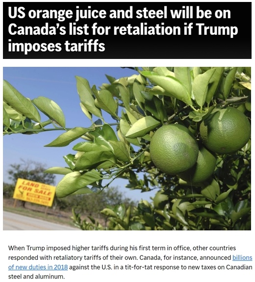 美聯社此前援引一名加拿大高級官員的説法報道稱,如果特朗普兑現其關税威脅,加方將考慮對美國的橙汁、盥洗用具和一些鋼鐵產品徵收報復性關税。據悉,特朗普常住地佛羅里達州大量出產柑橘等產品。