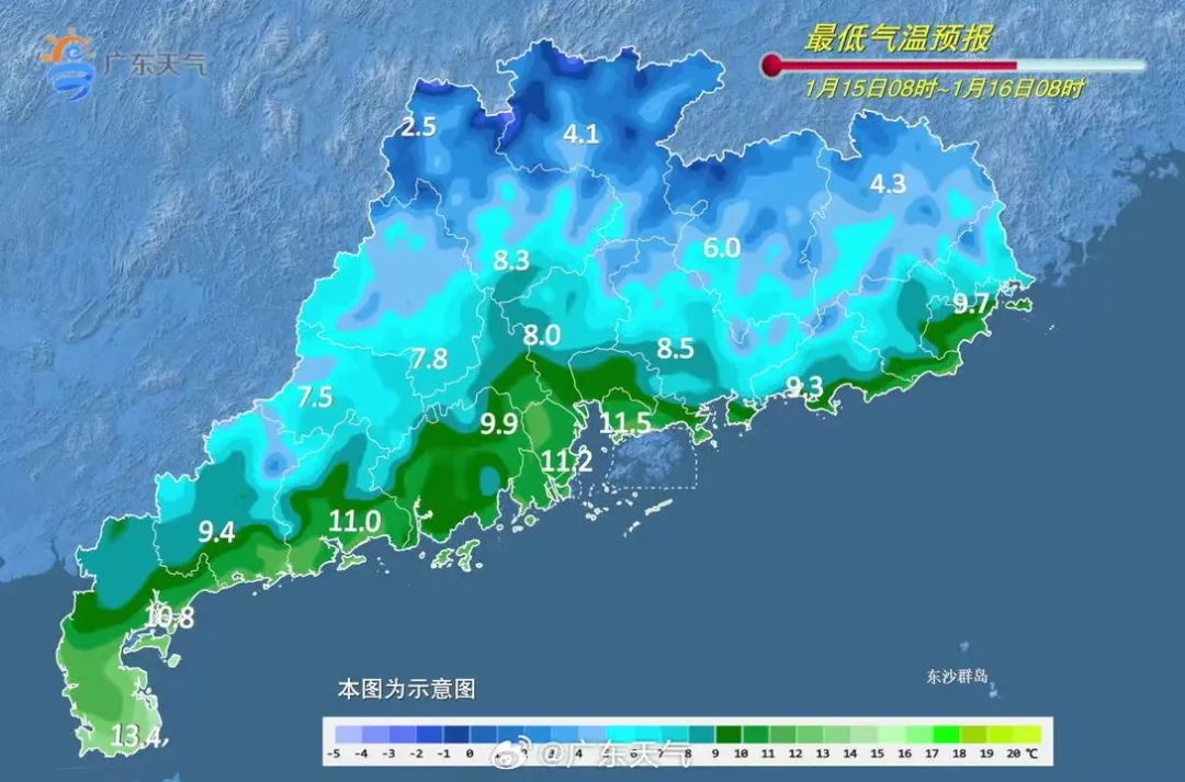 1月14日夜間至17日,新一股冷空氣影響廣東省,各地日平均氣温過程累計下降3℃—5℃,過程最低氣温將出現在1月17日早晨前後,粵北和珠三角北部有低於5℃的低温,其中高海拔山區-4℃—0℃,有(冰)霜凍。