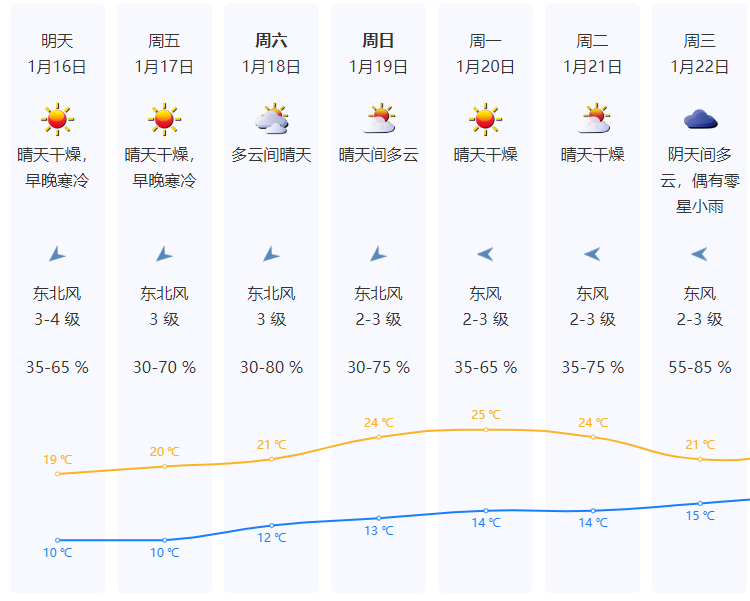 1月15日陰天轉多雲,氣温14℃—20℃,沿海、高地和海區最大陣風6—7級;1月16日—17日晴天干燥,最低氣温降至10℃左右;1月18日—20日多雲到晴天,氣温逐日回升。1月下旬中期有冷空氣影響,有1—2天寒冷天氣,間中有零星小雨。