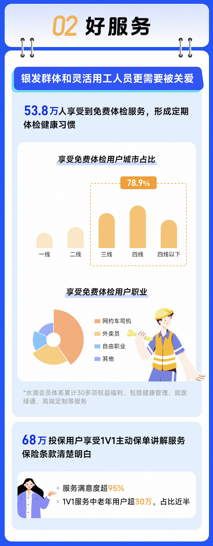 “三好服務”年報數據顯示,截至2024年底,水滴保累計為53.8萬人提供免費體檢服務,其中三線及以下城市用户佔比78.9%,覆蓋更多網約車司機、外賣員、自由職業者等靈活就業人員,幫助他們形成定期體檢健康習慣。