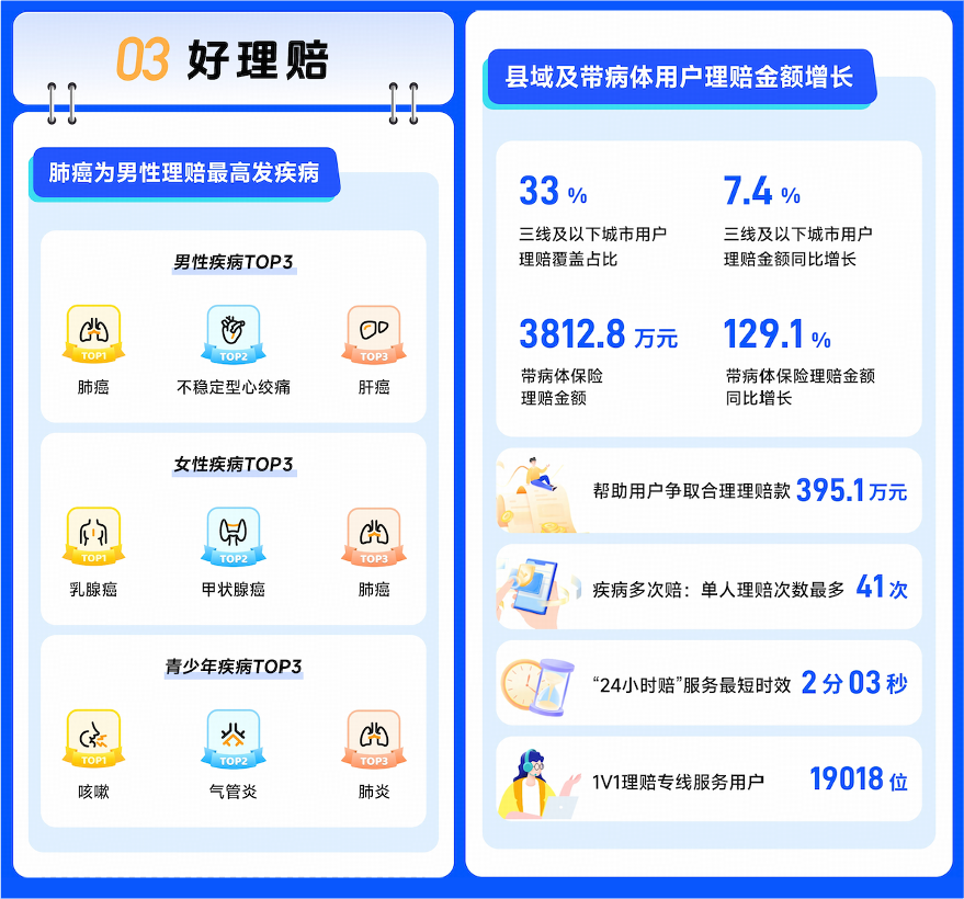 肺癌成男性理賠**高發疾病,縣域及帶病體用户理賠金額增長