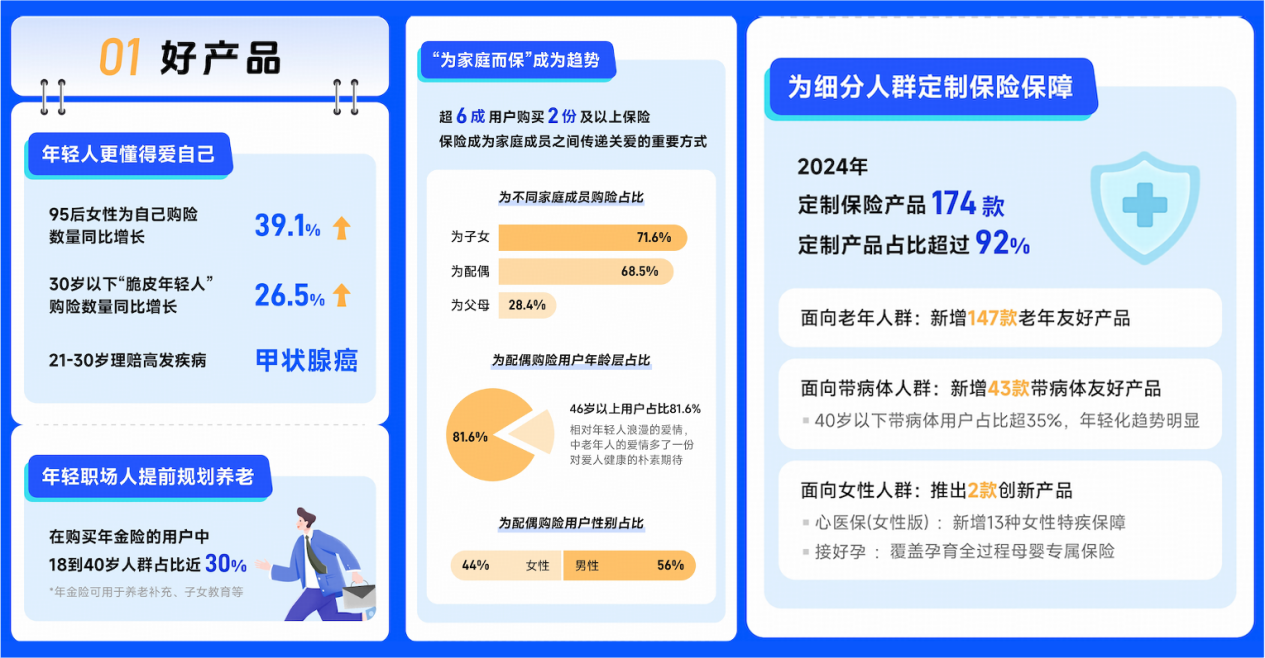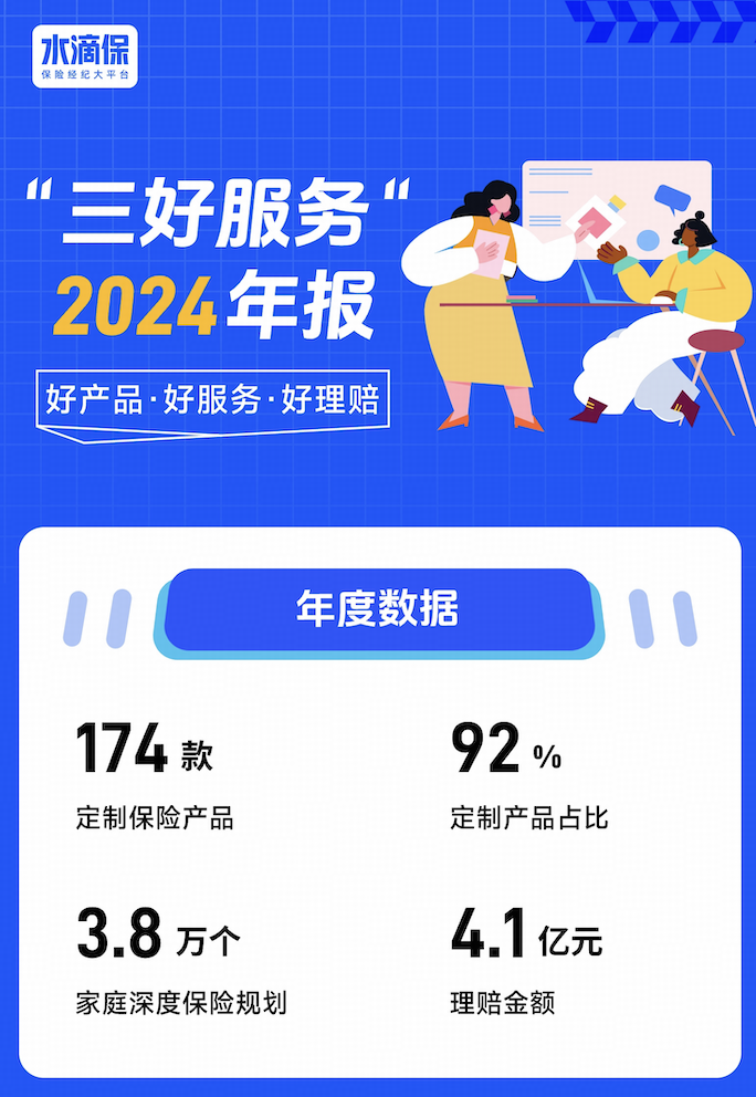 為更好滿足不同人羣對保障內容的多元化期待,2024年,水滴保上線定製保險產品174款,定製產品佔比超過92%,新增147款老年友好保險產品和43款帶病體友好產品,並面向女性人羣推出“心醫保(女性版)” “接好孕”等創新產品。