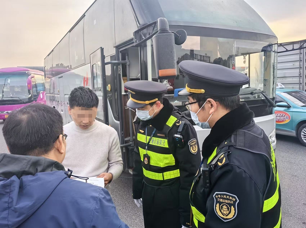 1月14日8時許,上海市交通委執法總隊的執法人員來到G2京滬高速江橋收費站,由市交通委執法總隊、嘉定區交通委執法大隊交通執法人員以及屬地交警組成的聯合執法隊伍正對沿途的客運大巴和貨運車輛開展執法檢查。