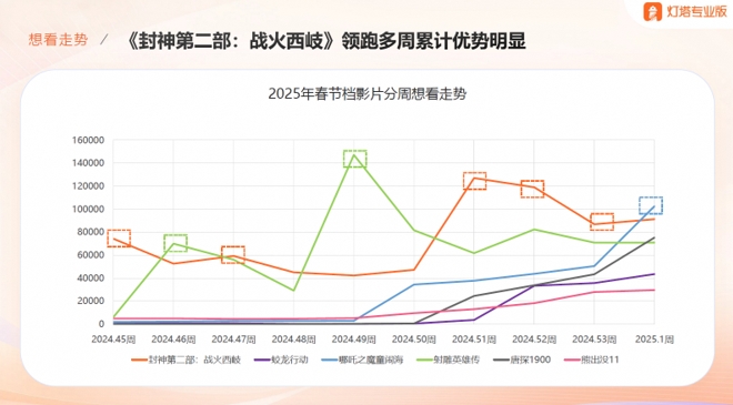 根據燈塔專業版數據,2025年春節檔影片映前90天至映前17天新增“想看”數據超218萬人次,創歷史同期新增“想看”新高,《封神第二部:戰火西岐》《射鵰英雄傳:俠之大者》《哪吒之魔童鬧海》位列映前“想看”榜前三名。