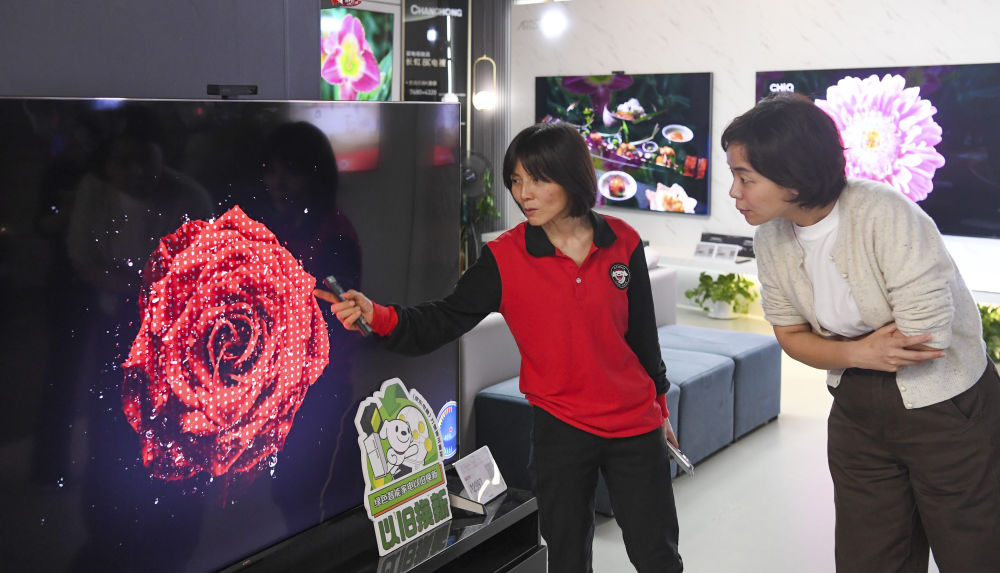 2024年10月17日,消費者(右)在位於重慶市江北區的京東電器超級體驗店瞭解電視產品。(新華社記者 王全超 攝)