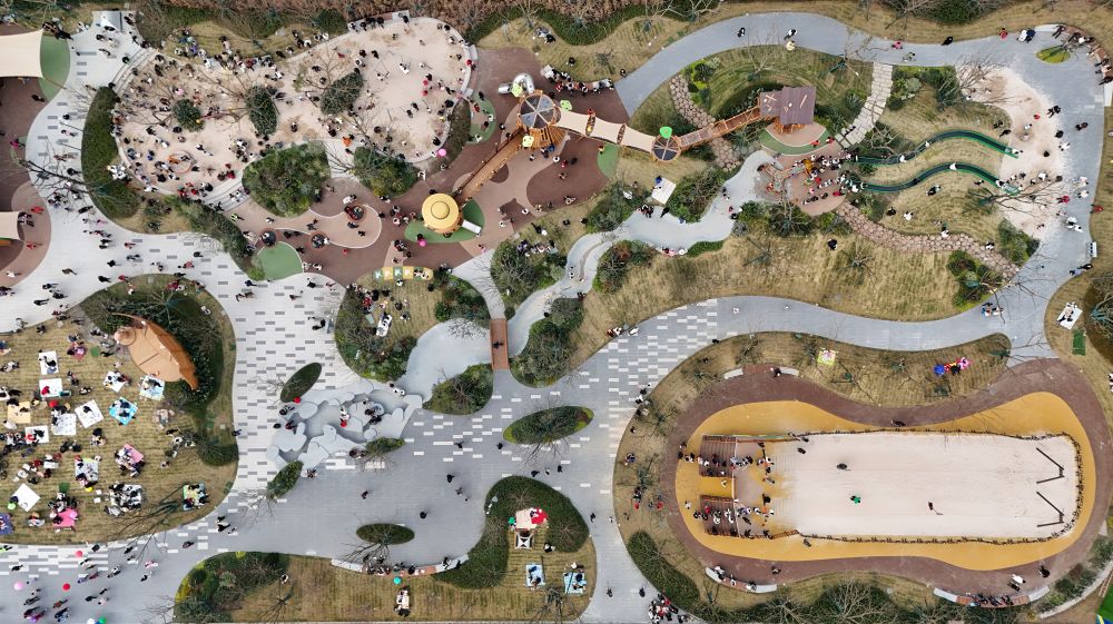 2025年1月5日,人們在位於成都天府新區的卡皮巴拉主題樂園玩耍(無人機照片)。四川成都將時尚潮購、品質生活、川味煙火等消費需求與全域消費資源相匹配,形成多元消費空間組合,推動多樣化的消費場景加速創新升級,以滿足消費者的需求。(新華社記者 劉坤 攝)