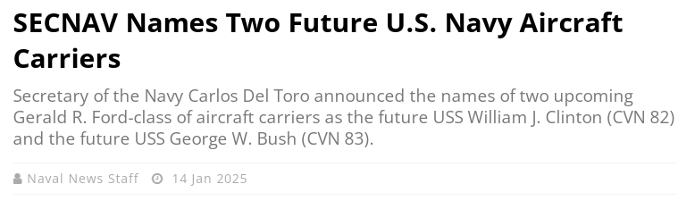 昨天有網友在後台留言,讓老司機幫忙介紹一下美國新命名的兩艘超級航母 “比爾·克林頓”號和“喬治·W·布什”號。可老司機覺得,這就有點為難了——因為美國海軍既沒有透露這兩艘航母的具體性能,也沒有説明它們的服役時間。而造成這種困境的根源,自然是美國新一代“福特”級航母混亂的建造規劃。